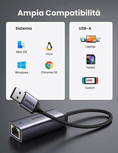 [ Forte e Durevole ] Con design in alluminio, il guscio offre una resistenza agli urti e ai graffi che i modelli precedenti non avevano. E il resistente design del cavo nylon protegge da danni e usura quotidiana. UGREEN adattatore USB Ethernet ti accompagna a lungo.