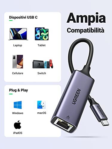 UGREEN Adattatore Ethernet USB C Gigabit 1000Mbps in Alluminio, USB 3.2 a LAN, Thunderbolt 3 a RJ45 per Steam Deck, iPad Pro 2021, Macbook Air/Pro M1/M2, Huawei Matebook, Galaxy S22/S21, Fire TV, ecc