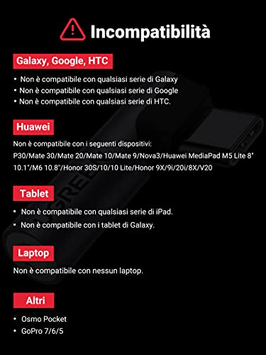 [ Non Compatibile ] Non Compatibile con tutti gli smartphone e i tablet Galaxy (S23/ S22/ S21/ S21 Ultra/ S20/ S20 +/ S20 Ultra/ Note 10/ Note 10 +/ S9/ S9 +/ S8/ S8 +), iPad Pro, iPhone, Google Pixel, HTC, Sony, Osmo Pocket, GoPro 7/6/5. Controllare il modello di telefono prima dell'acquisto.