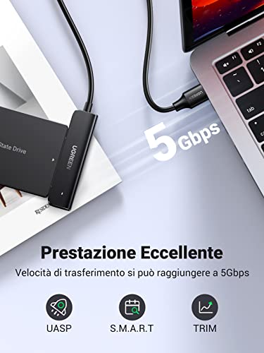 [ Buon Velocità con UASP ] UGREEN Adattatore SATA supporta la connessione USB 3.0 a 5 Gbps con UASP supportato, che è 10 volte più veloce di USB 2.0 e il 70% più veloce in meno di utilizzo della CPU rispetto all'USB 3.0 convenzionale quando si utilizza con UASP accelerato. Supporta anche S.M.A.R.T. e TRIM.