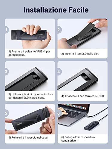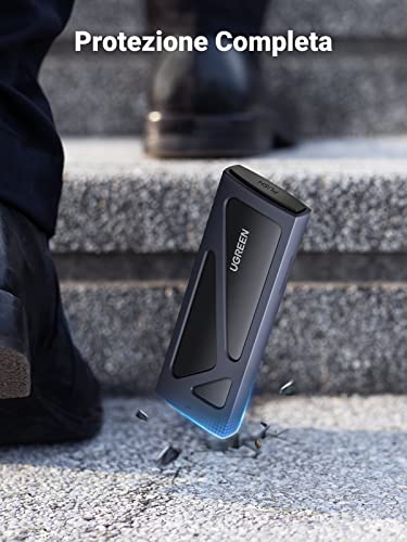 < Velocità di 10Gbps > Con l'interfaccia USB C 3.2 Gen 2 e UASP, UGREEN Case SSD NVMe M.2 raggiunge una velocità di 10 Gbps, che è abbastanza da trasferire file da 10GB in 10 secondi. Supporta anche le funzioni di S.M.A.R.T e di TRIM, che rende una trasmissione più stabile e sicuro.