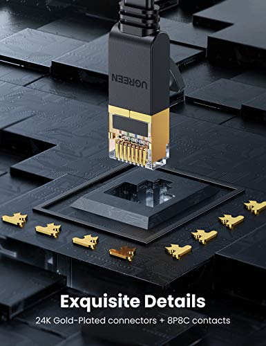 [ Trasmissione del Segnale Più Stabile ] UGREEN Cavo enthernet schermato è formato da 4 paia di fili di rame intrecciati e segregati dalla croce, il che protegge le fibre di rame dalla radio e dalle interferenze elettromagnetiche. Connettori RJ45 fatti in rame puro sono placcati in oro, sono molto resistente all'ossidazione e non verrà danneggiato dopo un uso prolungato, ed anche garantiscono la conduttività e stabilità di trasmissione del segnale di rete.
