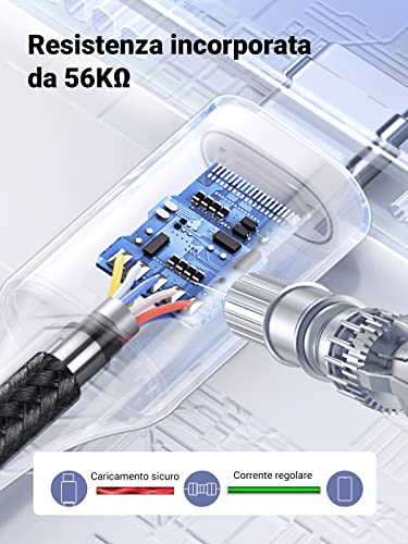 [Sicuro e Stabile] Il resistore integrato da 56K ohm e le schermature multiple del cavo di ricarica rapida USB di tipo C riducono la perdita di segnale, garantiscono la stabilità della ricarica rapida, proteggono i dispositivi da sovratensione, sovracorrente, sovraccarico e cortocircuito -circuito.