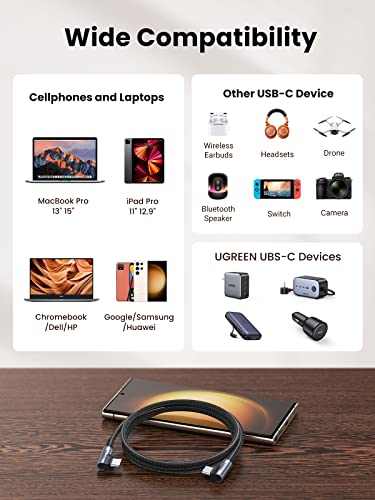 Design unico ad angolo retto: Cavo UGREEN da USB C a USB C con innovativo design ad angolo retto unico Cavo UGREEN da USB C a USB C con innovativo design a 90 gradi L, molto più comodo e comodo per giocare e guardare video durante la ricarica. Nota: Lo spessore massimo consentito della custodia è di 0,08 pollici