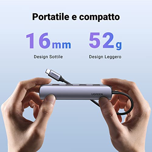 [ Sottile & Compatto ] Grazie alla finitura classica, UGREEN hub USB C si adatta perfettamente a qualsiasi ambiente. La dimensione è di soli 12,2 × 2,6 × 1,6 cm, leggera e ultra sottile, la lunghezza di cavo è 15,5cm. È un perfetto compagno durante lavoro o viaggio di affare.