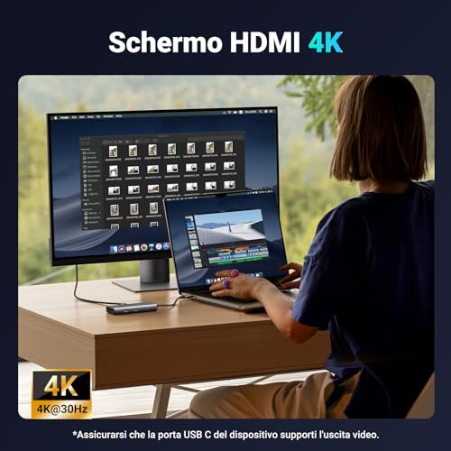 [ Display HD 4K ] Con questo adattatore da USB C a HDMI che supporta la definizione 4K@30Hz, è possibile collegare un grande display per riunioni, film o giochi. Nota: la porta USB C del computer host deve supportare lo streaming video (modalità DisplayPort Alt o Thunderbolt 3/ 4) affinché la porta HDMI dell'hub funzioni.