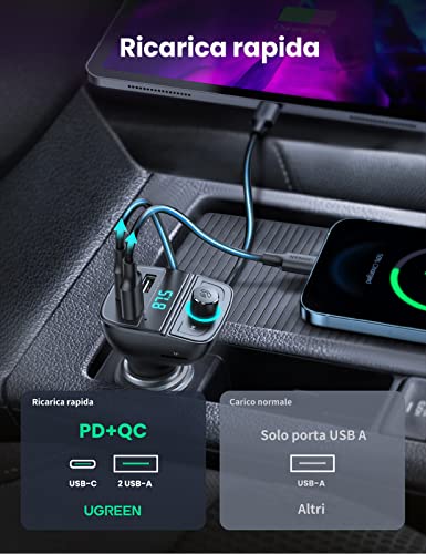 UGREEN Trasmettitore FM Bluetooth per Auto, 20W Caricabatterie Caricatore per Auto USB C PD e QC con Sistema Vivavoce, Lettore Musicale Bluetooth Wireless 5.0, Supporta Chiavetta USB e scheda TF