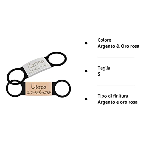 Colore: La targhetta per il nome del cane è disponibile in una varietà di colori - Nero, Argento, Oro, Oro rosa. Ogni set è composto da 2 colori, diverse combinazioni di colori ti danno una scelta migliore, puoi scegliere la combinazione di colori che ti piace e regalarla al tuo cane/gatto.