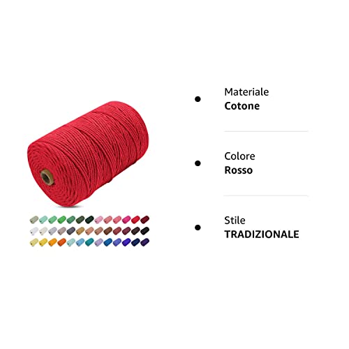 Uiopa Corda Macrame 3mm x 200m, Filo Macrame Cordoncino Cotone Naturale Spago Colorato Cordino per Borse Uncinetto, Wall Hanging, Decorazioni, Fai da Te, Piante da Appendere (Rosso)