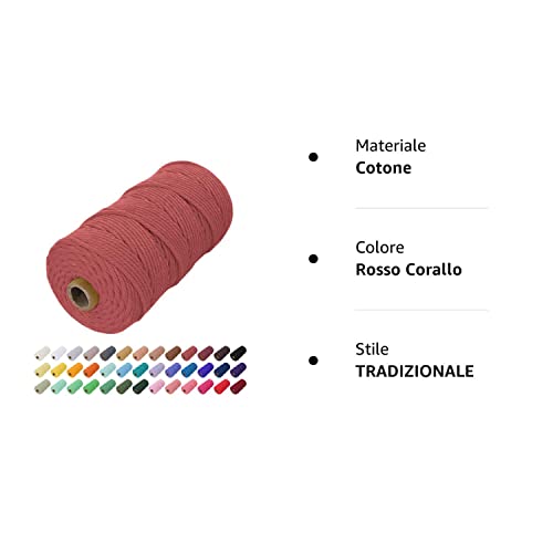 Uiopa Corda Macrame 2mm x 200m, Filo Macrame Natural Cordoncino Cotone Corda Colorata, Cordino per Borse Uncinetto, Arazzo da Parete, Cesto di Piante Appeso, Decorazioni Fai Da Te (Rosso Corallo)
