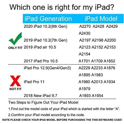 【Compatibility】: 2020 iPad 10.2(8th Gen)(A2270, A2428, A2429, A2430), 2019 iPad 10.2(7th Gen)(A2197, A2198, A2200), 2019 iPad Air 10.5(A2123, A2152, A2153, A2154), 2017 iPad Pro 10.5(A1701, A1709, A1852), (A2602,A2604,A2603,A2605)