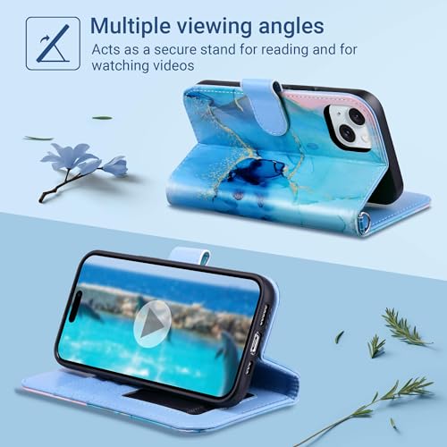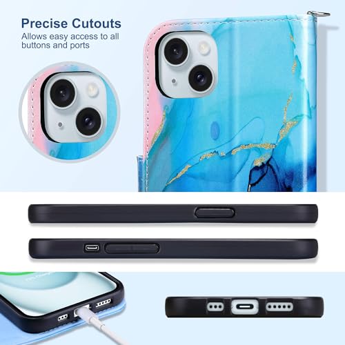 ULAK Compatibile con iPhone 15 Portafoglio con Porta Carte, Colorata Pelle Libro Magnetica Cavalletto Custodia per Apple iPhone 15 per Ragazze Donna, Marmo Blu