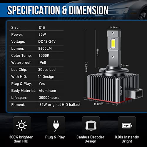 【Più di 30.000 ore di durata della vita】 - Le lampadine dei fari a LED D1S adottano chip CSP a LED, progettati per un raggio più focalizzato e più ampio. Luce bianca fredda da 6.500 K e 8.600 LM/coppia, 35 W/lampadina. 220% più luminose delle lampadine HID originali per auto. Nessuna macchia scura, super decodifica, fornendo ultra luminosità durante la guida su strada. Dimensioni compatte pur fornendo ultra luminosità.