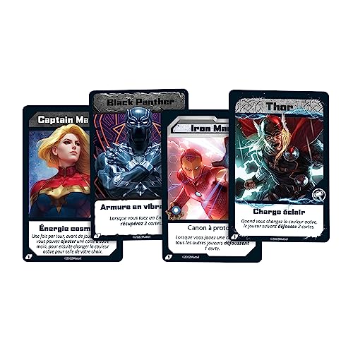 Ogni personaggio supereroe gioca con regole e poteri speciali nel proprio set di carte, con quattro supereroi tra cui scegliere: Captain Marvel, Iron Man, Black Panther e Thor!