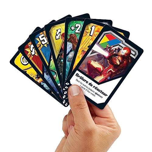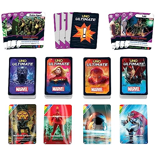 UNO Ultimate Marvel - Gioco di carte, design supereroe, Captain Marvel, Iron Man, Black Panther, Thor, regole speciali, carte di pericolo, carte da collezione, età 7+, HVM25