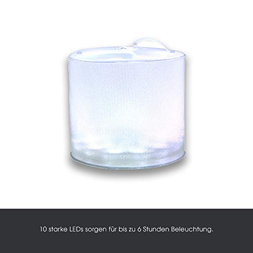 Questa elegante lanterna è completamente alimentata dal sole, non richiede batterie aggiuntive. 8 ore sotto la luce diretta del sole e la lanterna gonfiabile illumina fino a 6 ore con una sola carica.