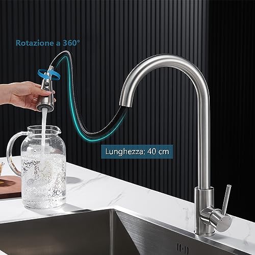 【Design flessibile ad estrazione】 Il rubinetto da cucina con doccetta estraibile è flessibile nell'estrazione, con una lunghezza di estrazione di circa 40 cm, che può estendersi intorno al lavello ed espandere l'area dell'acqua. L'ugello può ruotare liberamente di 360°, facilitando la pulizia di ogni angolo del lavello senza punti morti, e si ritrae con precisione dopo l'uso.