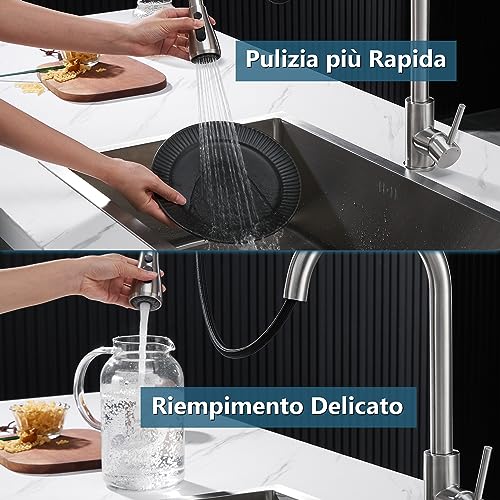 【3 modalità】 Il rubinetto da cucina è dotato di tre modalità regolabili, che possono essere alternate tramite il pulsante sull'ugello. Modalità Stream - Morbida e senza schizzi, adatta per riempire contenitori e lavare frutta e verdura. Modalità Spray - Potente per lavare le stoviglie o pulire rapidamente grandi aree. Modalità Pausa - Per interrompere rapidamente il flusso d'acqua.