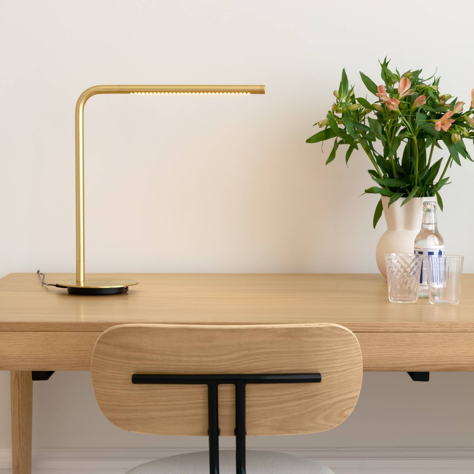 Lampada da tavolo a LED Omni Table con dimmer e presa USBLa lampada da tavolo Omni Table unisce forma e funzionalità. La lampada progettata da Søren Ravn Christensen, chief designer e co-proprietario di UMAGE, si adatta a qualsiasi interno ed è caratterizzata da una semplice eleganza. Omni Table è una lampada da tavolo multifunzionale in ottone spazzolato, che illumina l'area desiderata in qualsiasi momento grazie all'asta che può essere ruotata di 360° e orientata di 45° su ciascun lato. Il pulsante sulla base non solo la accende e la spegne, ma la oscura anche, e i piccoli fori nel modulo luminoso creano un affascinante spettacolo di luce. La base della lampada nasconde una porta USB che può essere utilizzata per collegare un telefono o un tablet e caricarlo direttamente sulla lampada.