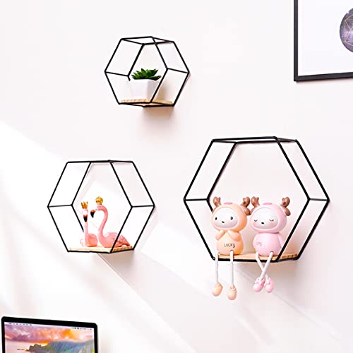 Umelee Set di 3 mensole esagonali, mensole sospese nere, mensole sospese in metallo e legno per camera da letto, bagno, soggiorno, cucina, lavanderia e decorazione da parete (Nero)