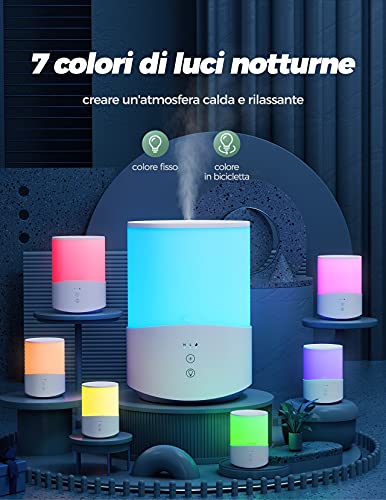 Luce d'umore opzionale in 7 colori Progettato con 7 luci d'atmosfera opzionali di colore, è possibile fissare su un colore preferito premendo nuovamente il pulsante. Le morbide luci a LED di, umidificatore a nebbia fredda, non solo aggiungono un'atmosfera romantica, ma possono anche essere utilizzate come luce notturna quando necessario.