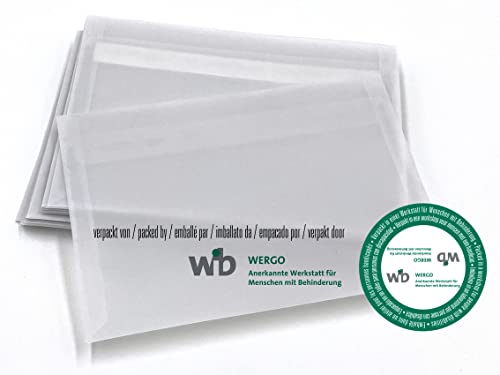 DETTAGLI DEL PRODOTTO: Inclusi nella consegna sono 100 buste trasparenti dalle dimensioni 162 x 114 mm (DIN C6). La dimensione è perfetta per fogli piegati una volta da DIN A5 e per fogli piegati trasversalmente da DIN A4
