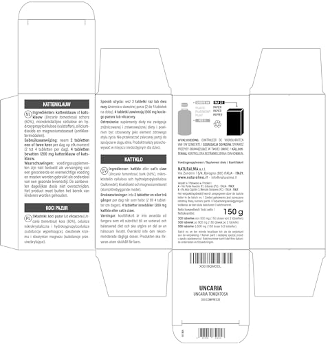 Uncaria (Uncaria tomentosa) cortecce 300 COMPRESSE da 500 mg (formato da 150 grammi). Prodotto in compresse, pastiglie o tavolette (non sono opercoli, capsule o softgel). 1 compressa contiene 300 mg di Uncaria.