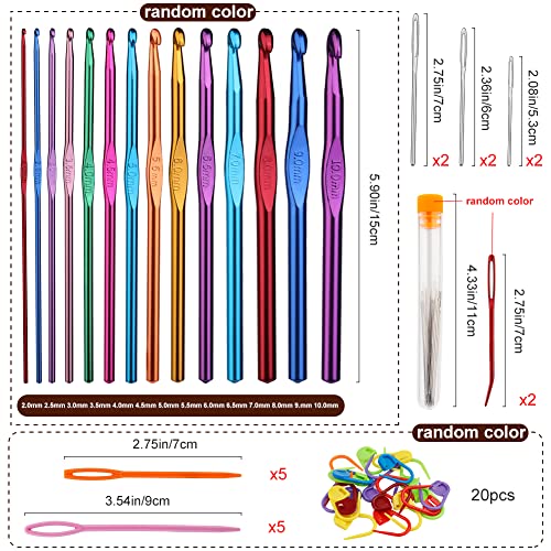 Il set di uncinetti include: uncinetti in alluminio*14, ago a cruna smussata*6 (53 mm*2, 60 mm*2,70 mm*2), segnapunti*20 (colore misto), flacone dell'ago*1, ago di plastica * 10, ago piegato a cruna grande * 2. I colori di cui sopra sono casuali.