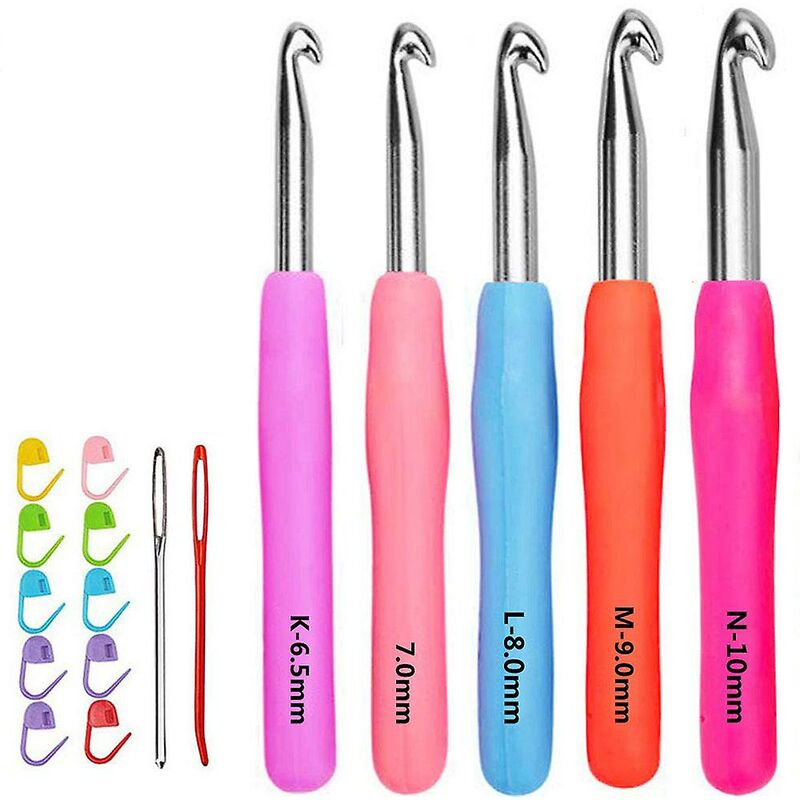 5 MISURE TRA CUI SCEGLIERE: Ci sono 5 ganci con manici in morbida gomma e teste in alluminio in un assortimento di colori accattivanti. È facile identificare e selezionare la taglia corretta per ogni gancio con codice colore. Le dimensioni di questi ganci sono 6,5 mm 7,0 mm 8,0 mm 9,0 mm 10,0 mm. All-in-One Accessori per maglieria che sono la grande aggiunta ai tuoi accessori e forniture per uncinetto e maglieria. MANICI IN GOMMA: tutti i nostri ganci sono realizzati con un manico ergonomico in gomma che è così facile da presa. I nostri uncinetti che sono piacevoli al tatto sono leggeri ma resistenti e privi di attrito rispetto ai tradizionali uncinetti. Le impugnature in gomma facilitano l'uncinetto attraverso le lane e i filati più pregiati. La comoda impugnatura ti consente di lavorare all'uncinetto per ore senza crampi, dita doloranti o stanche. Buono anche per le persone con artrite o sindrome del tunnel carpulare. FACILE DA USARE: Fantastico per adulti o bambini, principianti