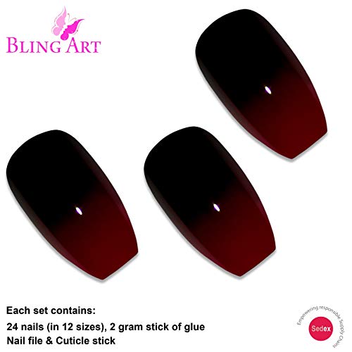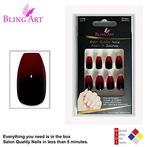 Unghie finte Bling Art Rosso Nero Ballerina Bara 24 Lunghe Finte punte in acrilico con colla