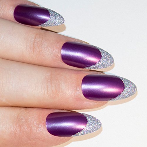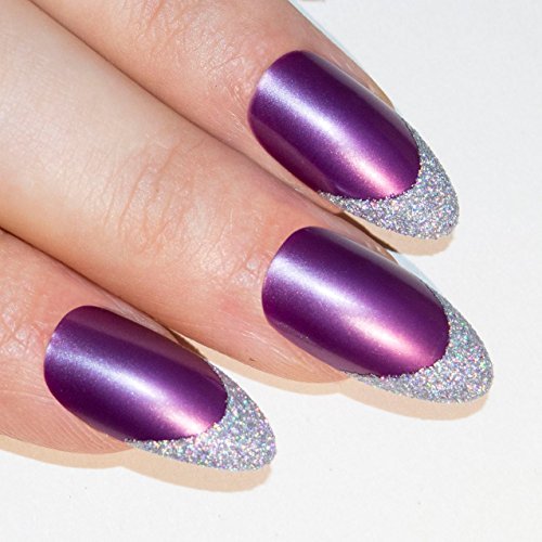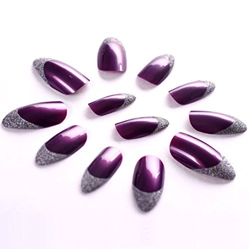 Unghie finte Bling Art Stiletto Viola Argento luccichio 24 Mandorla Lunghe punte in acrilico con colla