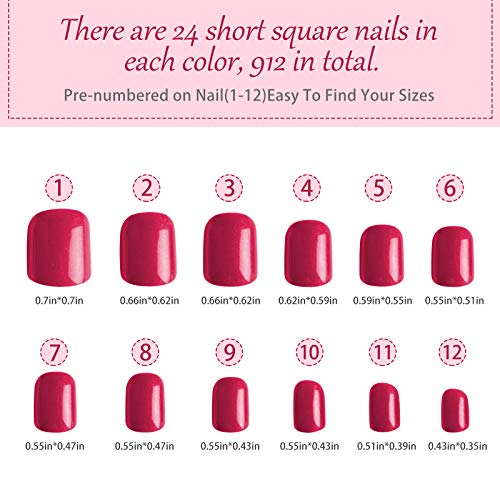 Contenuto Confezione: Riceverai 912 pezzi di unghie finte corte in 38 colori, facili da abbinare a diversi stili di abbigliamento, rendendoti più attraente tra la folla. Nota: linguette colla / adesive NON sono incluse