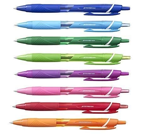 Uni-Ball Jetstream, penna con sfera molto sottile, penna retrattile con impugnatura in gomma, tipo 0,7 mm, confezione da 8 penne colorate (blu, celeste, verde, verde lime, arancione, rosa, rosso e viola)