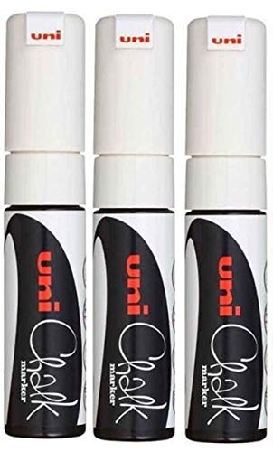 Uni-ball - Pennarelli a gesso liquido per lavagna, con punta a scalpello da 8 mm, per lavagna, lavagna magnetica, vetro e finestre, non permanente, confezione da 3 pezzi, colore: Bianco (rif. PWE-8K)