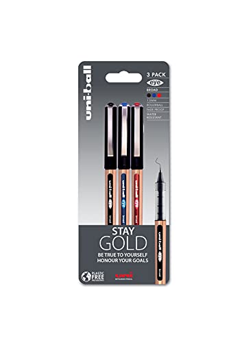 Uni-Ball On Point - Penne a sfera a forma di occhio Stay Gold, confezione da 3 pezzi, inchiostro nero, blu e rosso
