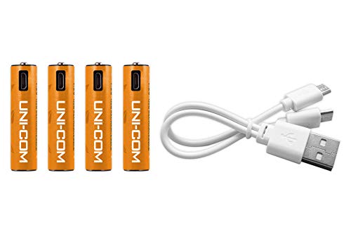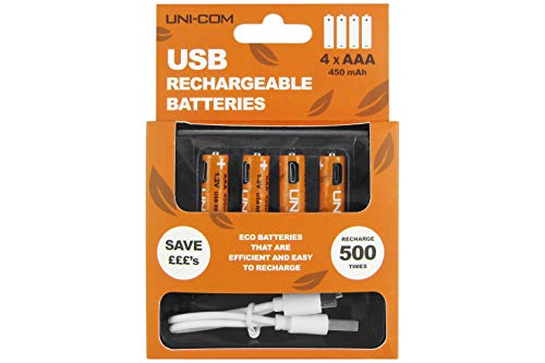 UNI-COM - Confezione da 4 batterie AAA Ni-MH ricaricabili con cavo micro USB, 450 mAh