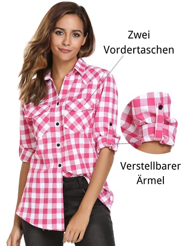 Unibelle, camicia da donna a quadretti, camicia a quadri, a maniche lunghe, in cotone, scollo a V, casual, stile Boyfriend, con maniche regolabili, taglia S-XXL Rosa M