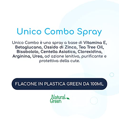 Unico Combo Spray - IDEALE PER LENIRE GLI ARROSSAMENTI - a base di Ossido di Zinco, Tea Tree Oil, Clorexidina ed Urea. Deratologicamente Testato su Pelle Sensibile. Flacone GREEN da 100ML