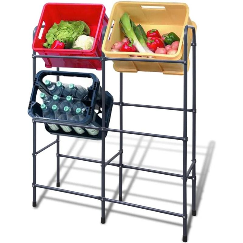 Questo scaffale pratico è adatto per 6 casse e sarà ideale per depositare casse pieghevoli per verdure e bibite e per la raccolta di materiali riciclabili. Sarà di grande aiuto per qualsiasi famiglia o dita perchè quasi dapertutto ci sono delle casse che hanno bisogno di essere depositate. Il modello inclinato permette accesso facile al contenuto delle casse e ti permette di guardare subito dentro. Questo scaffale per casse è adatto per 3 casse per verdura, per Euro bibiteo casse standardizzate. Lo scaffale è realizzato in acciaio resistente e costruito per durare. I piedi in plastica antiscivolo sono progettati per evitare l'eventuale slittamento della struttura. Colore: Grigio scuro Dimensioni: 96 x 33 x 116 cm (L x P x A) Peso: 3,7 kg Materiale: acciaio verniciato a polvere + piedini in plastica Adatto per 6 casse pieghevoli Max. Peso per cassa: 17 kg