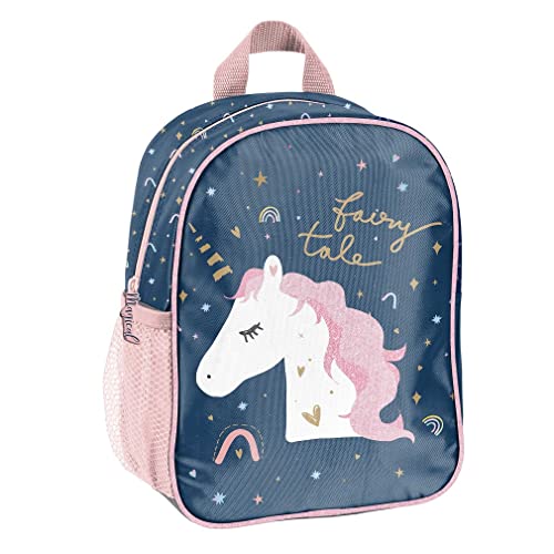 Zaino da bambina in blu scuro, rosa e oro con grande motivo unicorno per l'avvio del kita e pratico da portare in giro. Adatto per borraccia, contenitore per il pranzo e molto altro. Incantevole con criniera glitterata arcobaleno. Grazioso zaino per bambini per l'asilo. Dimensioni: 29 x 23 x 10 cm