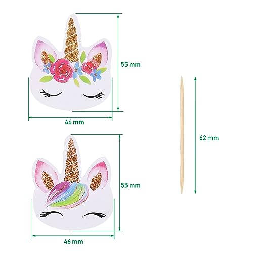 Pacchetto incluso: 24 bastoncini per stuzzicadenti, 24 adesivi circolari biadesivi e 24 pezzi di 2 stili di simpatici toppers per cupcake unicorno, ogni stile 12 pezzi, il topper è 5,5*4,5 cm, la lunghezza dello stuzzicadenti è 6 cm