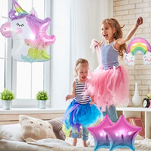 Decorazioni di compleanno per unicorno: palloncini in lattice da 30 pezzi da 12 pollici (palloncini rosa, menta, viola), palloncini in lattice da 30 pezzi da 5 pollici (rosa, menta, viola), palloncini 3 pezzi, palloncini unicorno 2 pezzi 3D, palloncini foil stella 2 pezzi, palloncino foil arcobaleno 1 pz, 1 pz "HAPPY BIRTHDAY" banner, 1 set di toppers per cupcake, 1 set di nastri ad arco di palloncini, 1 set di nastri in rotolo. Decorazioni di compleanno per ragazze unicorno per bambini.