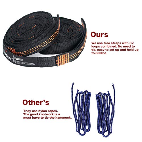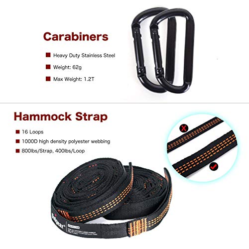 AMACA DOPPIA CON CINTURINI PER ALBERO: tutti gli attrezzi sono in una borsa. Vieni con tutto il necessario: amaca da campeggio di doppia dimensione, moschettoni in acciaio massiccio e cinghie per alberi di 3 metri. Le estremità dell'amaca sono state aggiornate con un cinturino in nylon più resistente. Tutto il design rende l'impostazione su amaca più facile e sicura che mai