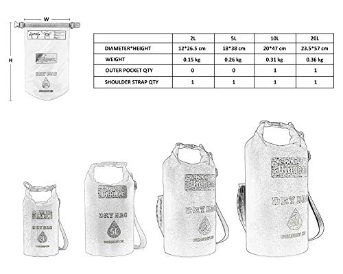 Tracolla e borsa a rete: La borsa a secco è dotata di una lunga tracolla removibile e regolabile per un facile trasporto e trasporto, inoltre 10L e 20L con borsa a rete possono essere posizionati per bollitori, bottiglie d'acqua e altri oggetti, facili da trasportare e pronto all'uso.