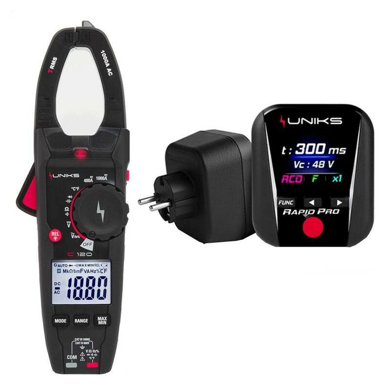 Kit Uniks composto da: Pinza amperometrica Uniks C120 professionale 1000V - 1000A RMS Presa multifunzione Uniks Rapidpro CAT III 300V tascabile per la verifica degli impianti elettrici, display a colori La pinza amperometrica Uniks C120 è progettata per l'uso in ambienti industriali. Effettua misure TRMS di tensione fino a 1000 V e corrente fino a 1000 A AC/DC, misure di frequenza, capacità, prova diodi, continuità e resistenza. Il design moderno, la meccanica fluida e precisa sia per l'apertura del toroide che per il commutatore agevolano il lavoro in campo. È dotato di rilevatore di tensione integrato che si accende quando posizionato vicino a conduttori attivi e di torcia integrata che permette di lavorare anche in luoghi molto bui. Uniks C120 esegue le seguenti misure: Tensione DC e AC TRMS fino a 1000V Corrente AC TRMS fino a 1000A Test di resistenza e continuità con cicalino Capacità e frequenza con puntali e un toroide Ciclo di lavoro (ciclo di lavoro) Prova diodi