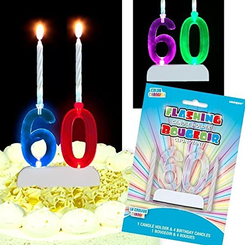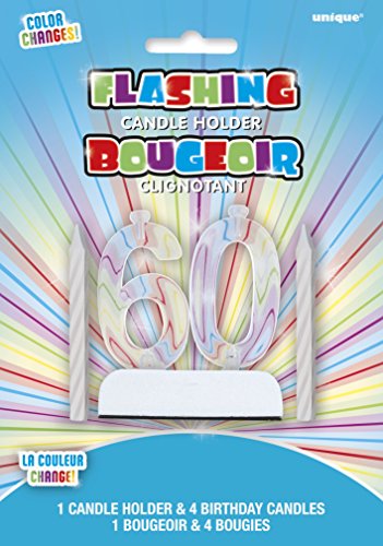 Unique Party 37546 - Candela di Compleanno Numero 60 Cambia Colore Lampeggiante Portacandela Con 4 Candele
