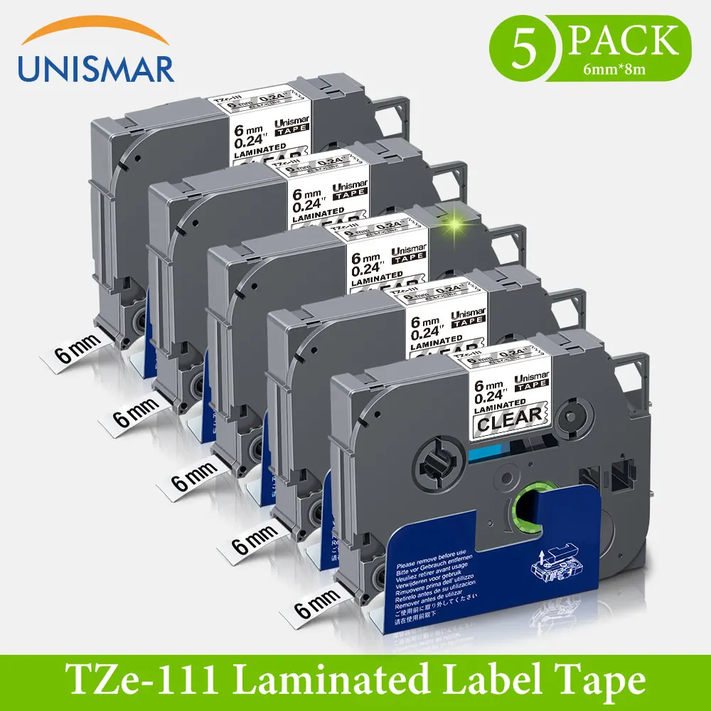 Unismar 5PK Tze111 6mm Black on Clear Compatible Brother for p-touch Printers tze-111 tz111 tz-111 tz tze 111 Label Tape Ribbon