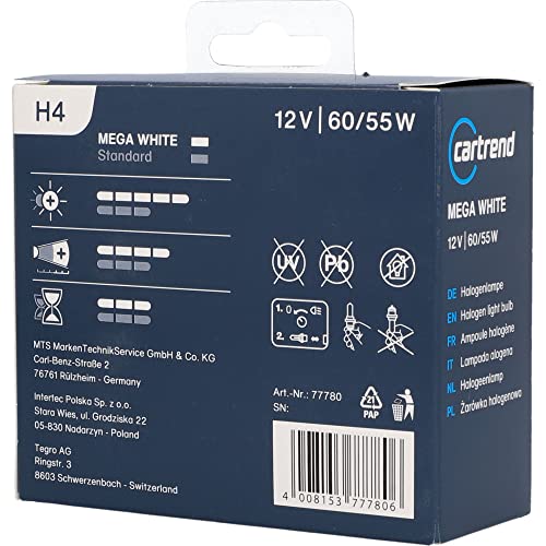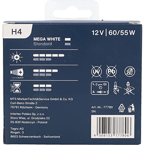 Unitec 77780 - Set di 2 lampadine per fari anteriori H4 Xenon MegaWhite, 12V, 55W
