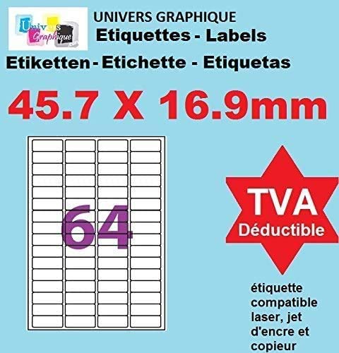 UniversGraphique, 1280 Etichette Adesive su Fogli A4, Colore Bianco, 45.7 x 16.9 mm, Fogli 20, 64 Etichette per Foglio, Ref UGE064-R1