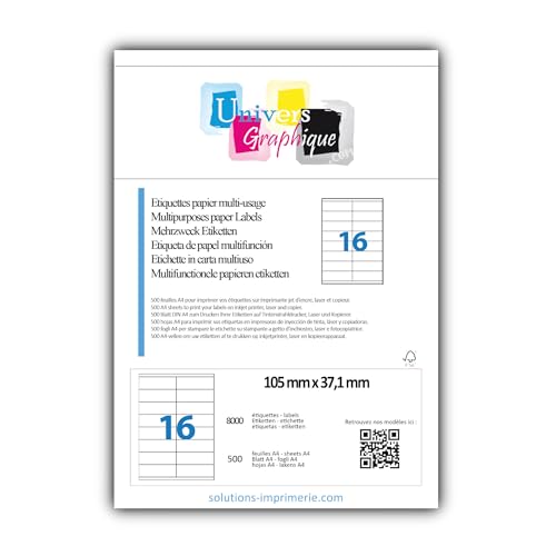 UniversGraphique, 8000 Etichette Adesive su Fogli A4, Colore Bianco, 105 x 37.1 mm, Fogli 500, 16 Etichette per Foglio